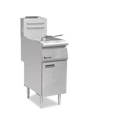 Commercial gas fryer equipment operates on gas, featuring a 21-liter tank capacity. Adjustable temperature control ranges from 50 to 190 degrees Celsius.