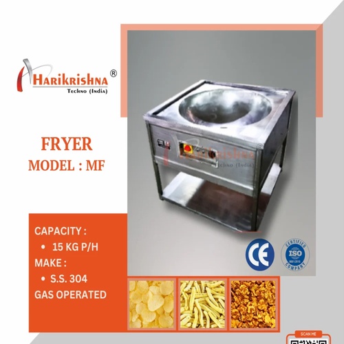 Semi-automatic commercial gas fryer machine. Offers 15 Kg/hr capacity. Constructed from SS material, operating on 230V, 50 Hz single phase power.