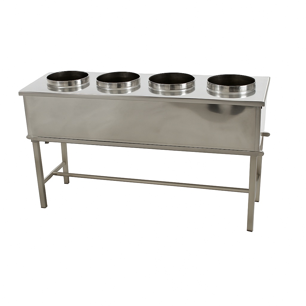 This commercial hot case is constructed from polished stainless steel with a rectangular shape. It measures 4 feet in length and features 4 bain marie compartments for keeping food warm.