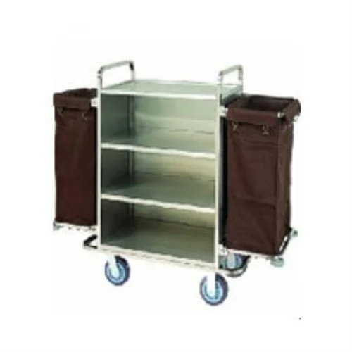 Heavy-duty housekeeping trolley for commercial use. Provides ample space for cleaning supplies and equipment, ensuring efficient service operations. Sturdy construction for reliable performance in busy environments.
