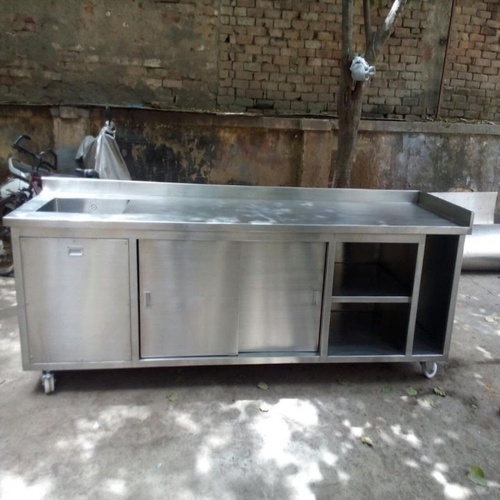 Commercial island table with customization options and a sink. Features include slide way functionality. Service location type: Commercial. Made in India.