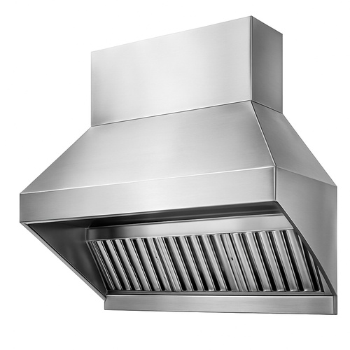 Commercial kitchen exhaust equipment with 230V, 50Hz operation. Features 3000 m3/hr air capacity, 2880 RPM fan speed, and 5-micron filtration. Made of SS with chrome finish.