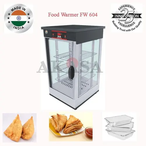 Three-shelf commercial food warmer, model FW 604. Stainless steel construction with 600W power and 60 LTR capacity. Dimensions: 16x18x29 inches. Suitable for hotels.