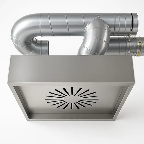 Polished silver stainless steel machine for commercial kitchen ventilation. Durable, made in India. Ideal for professional culinary environments.