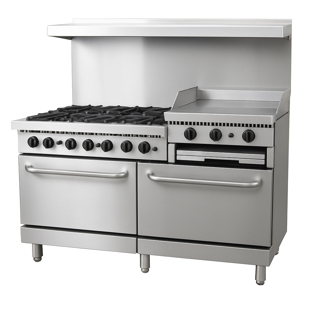 Commercial LPG cooking range stove. Made of mild steel with a silver finish. Designed for heavy-duty gas fuel usage in commercial settings.