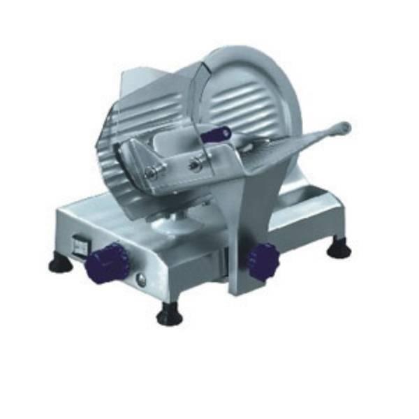Commercial meat slicer with a 195 mm blade. Features 0.15 hp motor, 13 mm cutting thickness, and 162 mm carriage run for efficient food preparation.