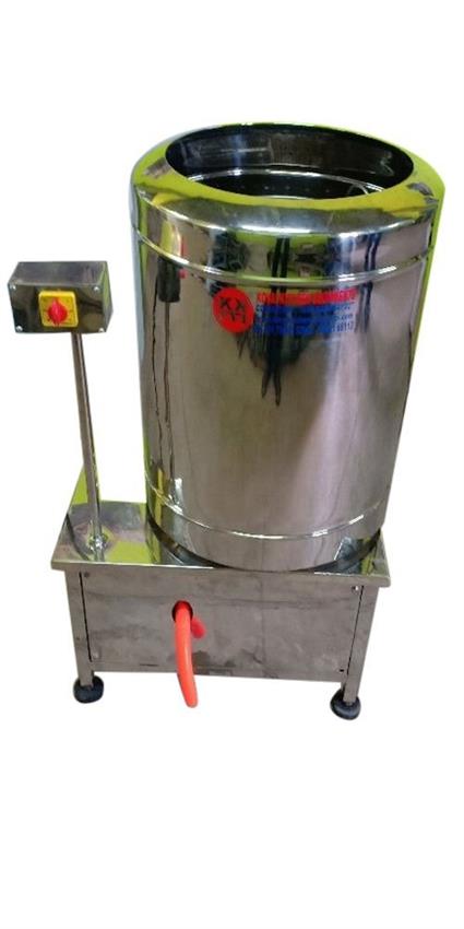 Automatic stainless steel oil dryer machine for commercial applications. Features 20-liter capacity, 220 V voltage, and 40 Hz frequency. Polished silver finish.