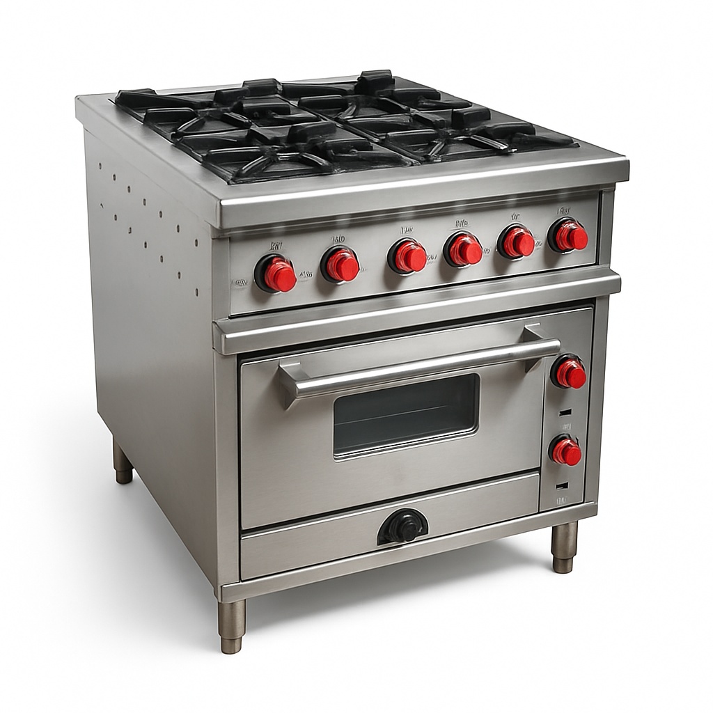 Polished 4x4 feet commercial cooking range with oven. Features four burners, suitable for restaurant applications. Durable stainless steel construction.