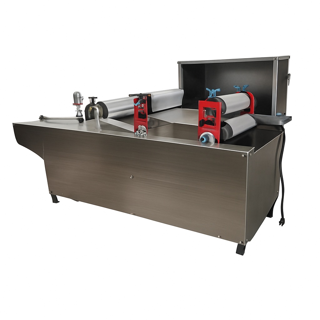Commercial semi-automatic bhakri making machine. Horizontal design with 500 chapatis/hour capacity. Adjustable chapati thickness: 1 mm, 1.5 mm, 2 mm.