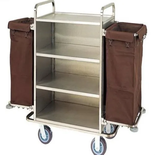 Stainless steel commercial hospital housekeeping trolley. Features 3 shelves, 48"x22"x34" dimensions, and a 0-50 kg loading capacity for medical facilities.