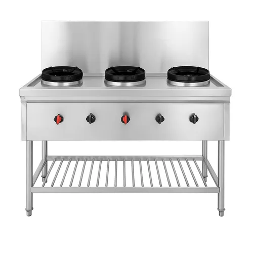 Polished stainless steel commercial Chinese cooking range for LPG. Ideal for high-volume restaurant operations. Durable construction, made in India, designed for demanding culinary environments.