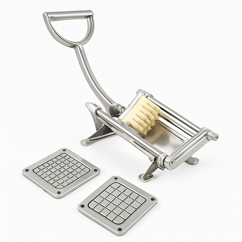 White stainless steel French fries cutter machine designed for commercial use. Features durable SS blades for efficient slicing. Operates manually, no voltage required.