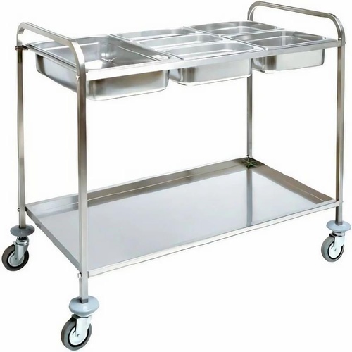 SS 304 stainless steel commercial cart for hotels and restaurants. Features four wheels for easy mobility. Ideal for GN pans.