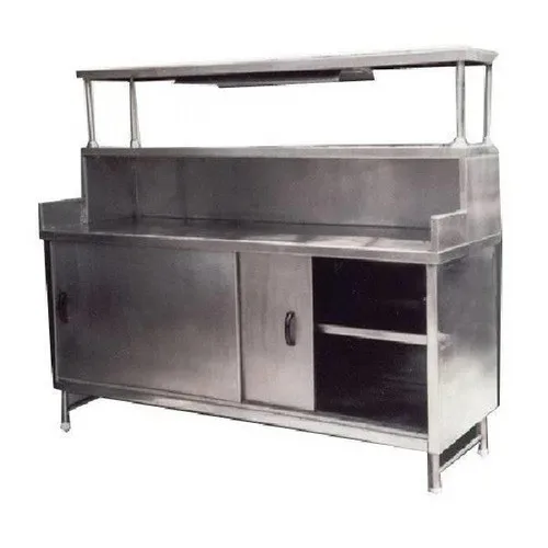 Commercial pickup counter made from stainless steel. Designed for practical use in commercial environments. Features a durable construction for consistent performance and easy maintenance. Ideal for various service areas.