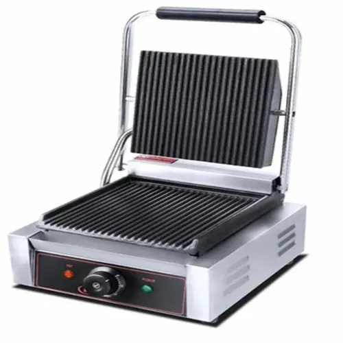 Semi-automatic stainless steel sandwich griller machine for restaurant use. Features rust-proof construction and a 4-piece capacity. Silver color, 2ft height.