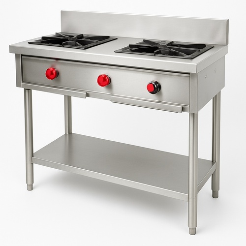 A commercial 2-burner gas stove measuring 30x30x24 inches, powered by LPG. Features manual ignition, knob controls, and a robust stainless steel construction.