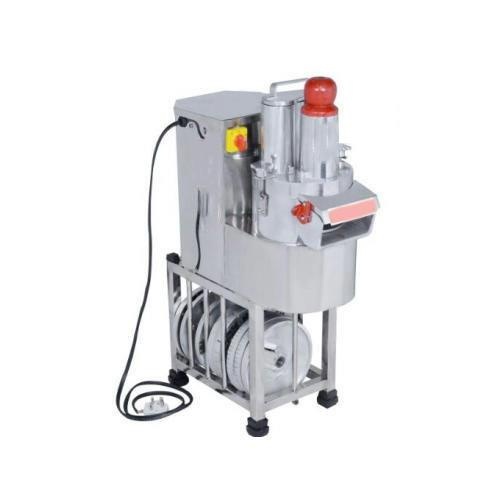 Semi-automatic commercial vegetable cutting machine made of SS-304 stainless steel. Slices at 2-4mm thickness, <200 kg/hr capacity. 220V electric powered.