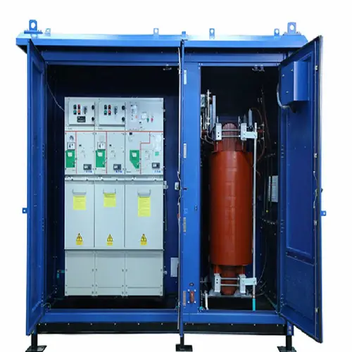 Three-phase, air-cooled compact substation transformer with 433V ratio. Features an aluminum winding and blue, floor-mount design for versatile electrical applications.
