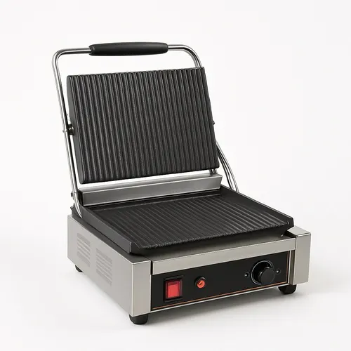 A small, compact electric griller designed for efficient food preparation. This versatile machine is suitable for various grilling needs in a professional setting.