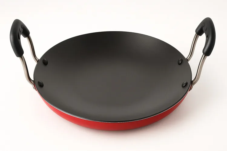 Red aluminium non-stick concave tawa cookware, 3.2mm thickness, 300mm diameter. Features a 3-layer non-toxic non-stick coating and a stainless steel handle with heat-resistant plastic.