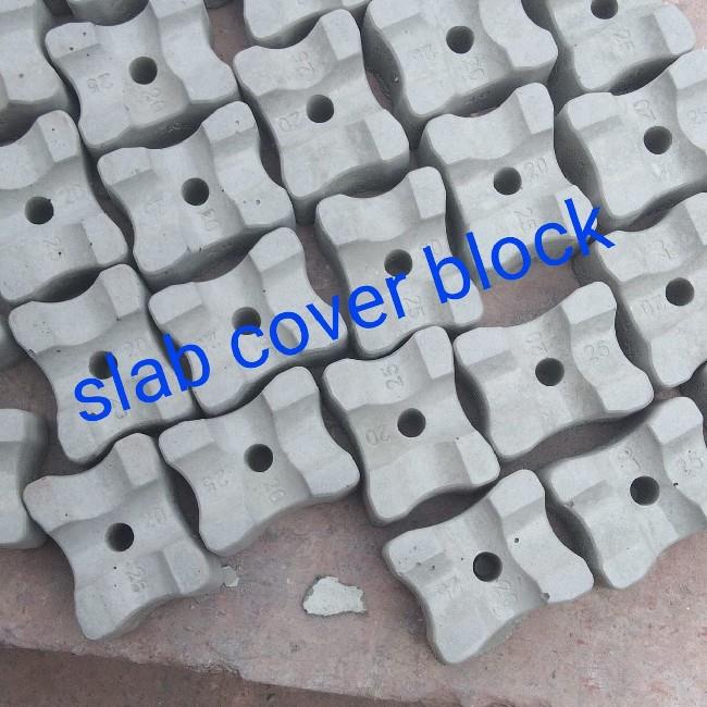 Standard concrete cover block used in construction to maintain adequate cover for reinforcing steel. Essential for structural integrity and durability.