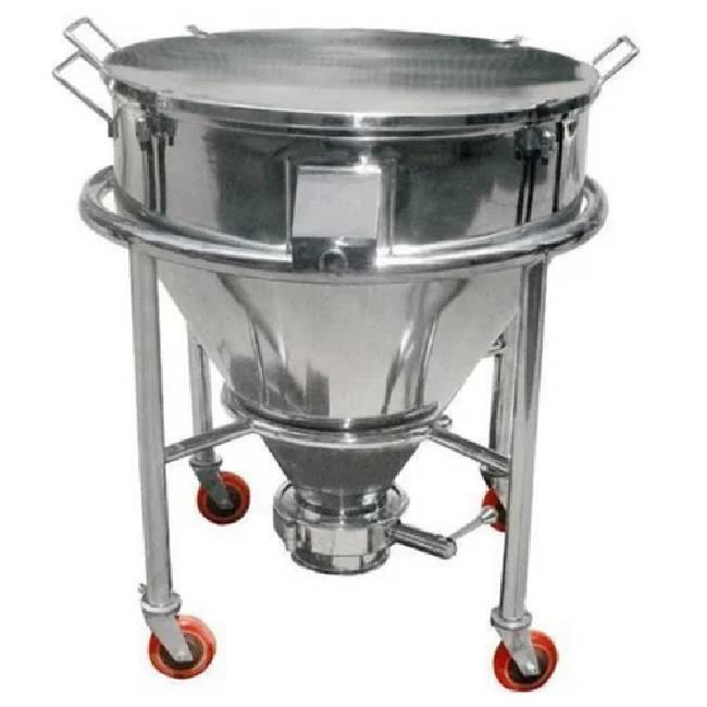 10-300 kg capacity conical IPC bin with 4 PU wheels. Pharma industry application with a surface finish of less than 0.3 Ra for optimal hygiene.