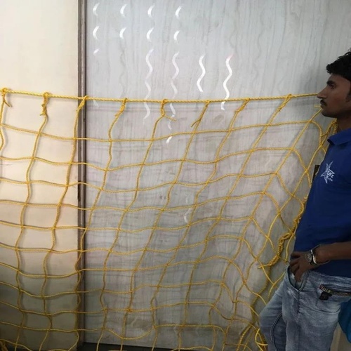 Plastic cargo net for container export. Yellow, 8 ft x 8 ft size, made in India with 6 months warranty. Ideal for secure cargo transport.