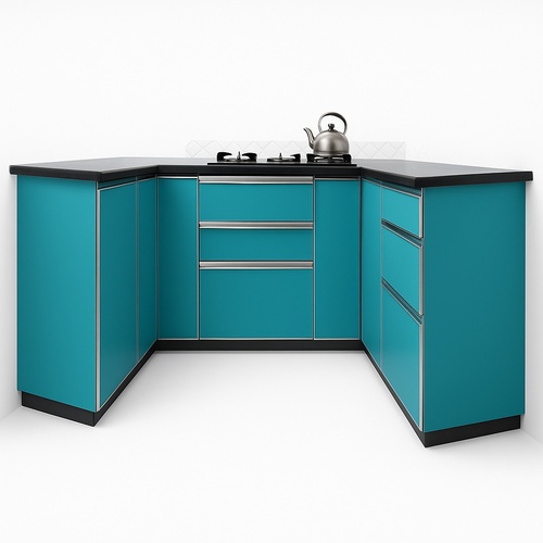 Modern L-shape modular kitchen crafted from aluminum. Features contemporary design and durable aluminum construction for efficient kitchen layout and functionality.