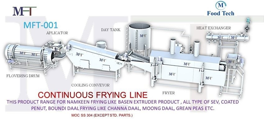 Automatic stainless steel continuous frying line for Besan extruder products. Features 350 Kg/hr capacity, 6 Hp motor, and three-phase electric power.