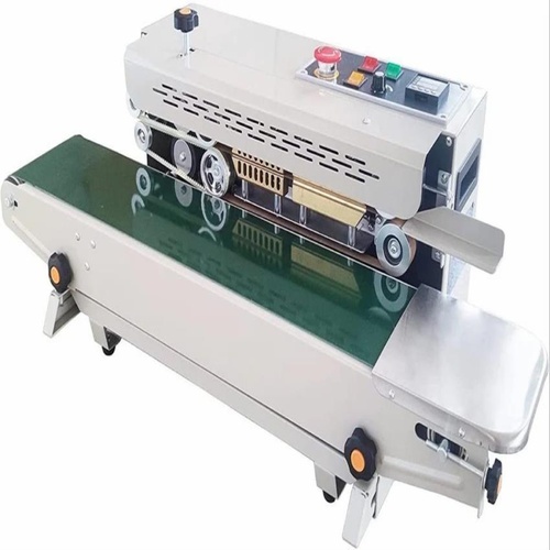 Semi-automatic stainless steel continuous sealing machine with 15-20 packets/min capacity. Features 100W power, India origin, and carton packaging.