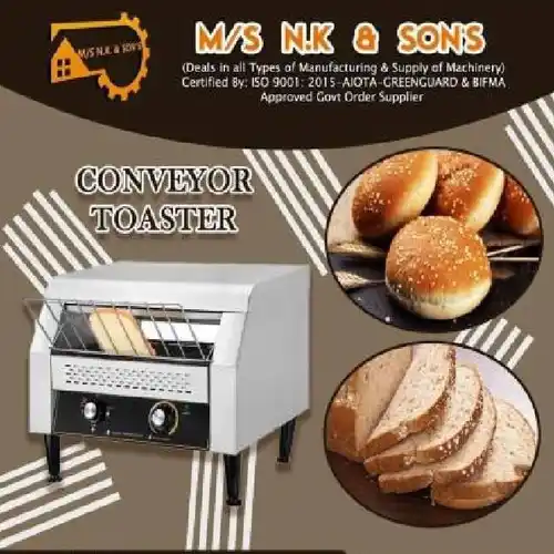 Stainless steel conveyor toaster for toasting. Features a capacity for 150 slices. Operates at 1500W power consumption. Dimensions: 29 x 42 x 39 cm. Ideal for consistent toasting.