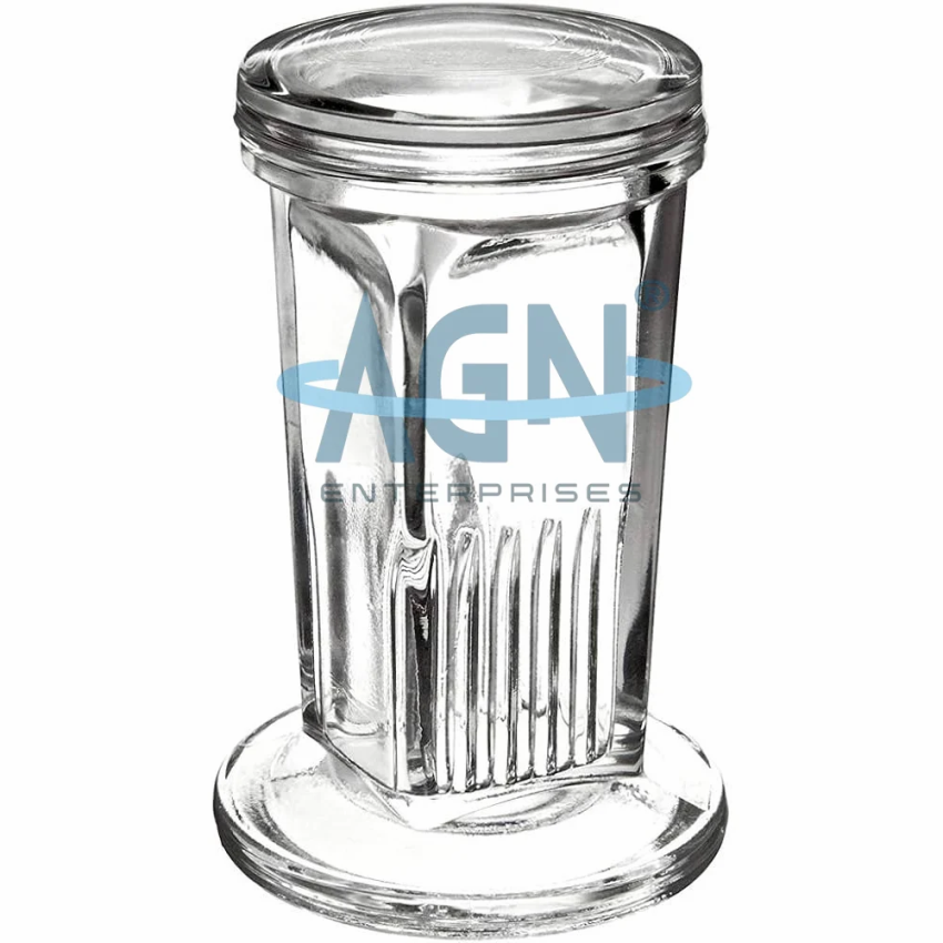Glass or Polypropylene Coplin Jar, designed to hold 5 single slides vertically or 10 slides back-to-back. Made in India.