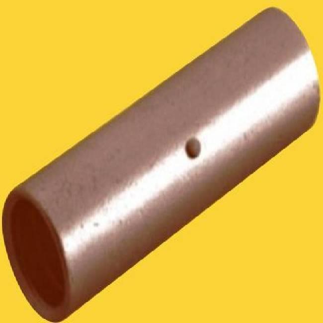 Round copper inline connector with an electro-tinned finish. Made from high-quality copper material. Suitable for various electrical connections.