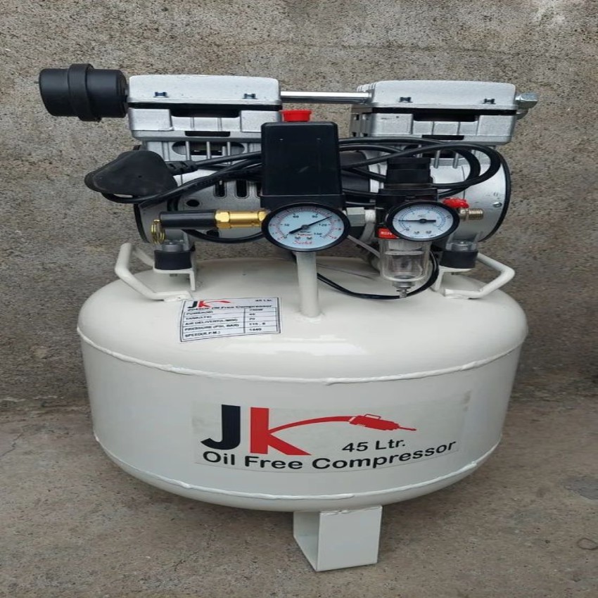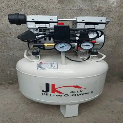 Manual oil-free dental air compressor with a 40L tank capacity. Features a 1 HP motor and copper wading for durability. Made in India. Single unit order.