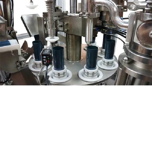 Stainless steel cosmetic packaging machine with mirror finish. Operates on 450v, consuming 2 to 4 kW (3 hp). Offers a capacity of 10 to 15 units.