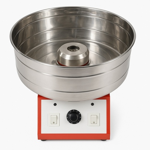Automatic single-phase electric cotton candy machine. Features 500 Watt power, 220 V voltage, and construction from stainless steel and mild steel. Made in India.