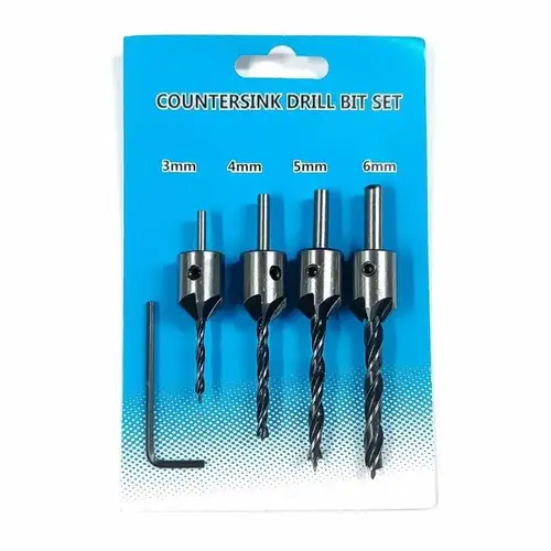 Countersink drill bit set including 3mm, 4mm, 5mm, and 6mm sizes. Ideal for creating clean chamfers. Packaged on a blister card for easy display.