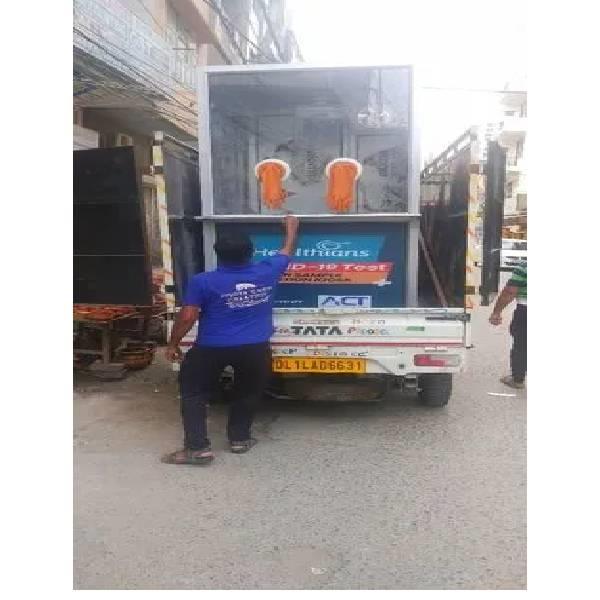 Modular COVID-19 sample collection kiosk, 7.5 feet height. Constructed from aluminum, ACP sheet, and glass. Eco-friendly and square-shaped design.