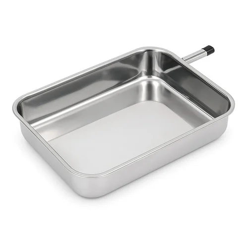 Stainless steel milk collection tray with a mirror finish. Rectangular shape, 24''x18''x2.5''. Grade 304 steel for hygienic milk collection.