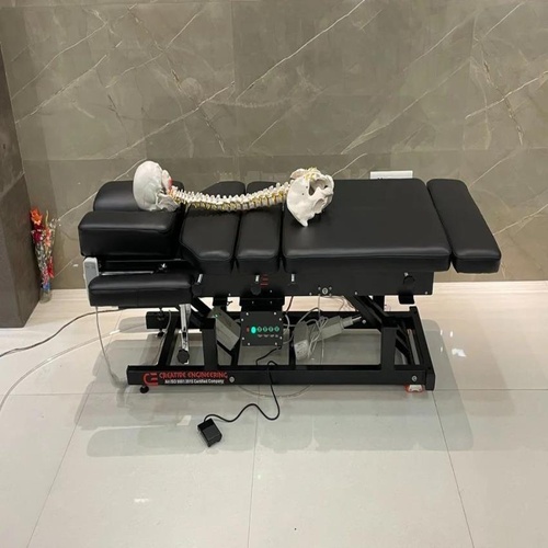 Hospital-grade chiro table with adjustable height, 150 KG load capacity, and integrated footrest. Made in India for demanding medical environments.