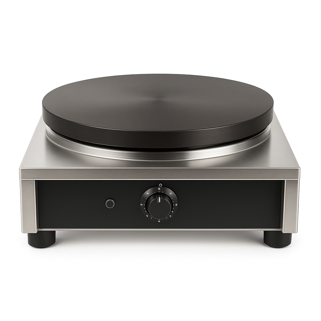 Semi-automatic crepe maker, available in single and double configurations. Made in India for commercial kitchen use. Standard design for efficient crepe production.