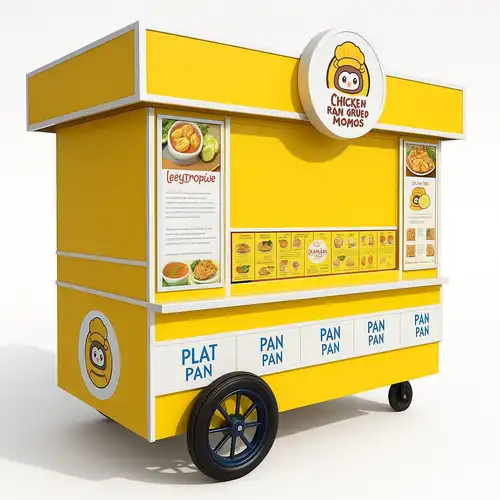 Food cart specializing in crispy fried chicken momos. Each piece weighs 100gm, with 4 pieces per pack. Features include saturated fat for enhanced flavor.