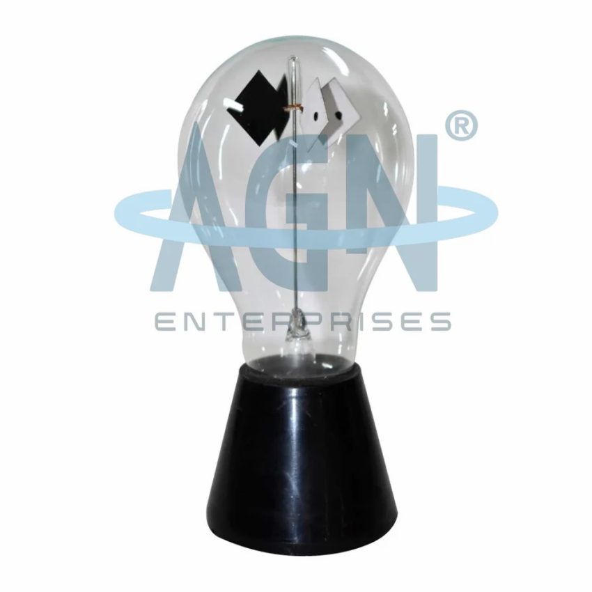AGN CROOKS RADIOMETER, model AGN-PHN 19. Features a glass bulb with partial vacuum and vanes with distinct black and white sides. Made in India. Ideal for demonstrating radiation pressure.