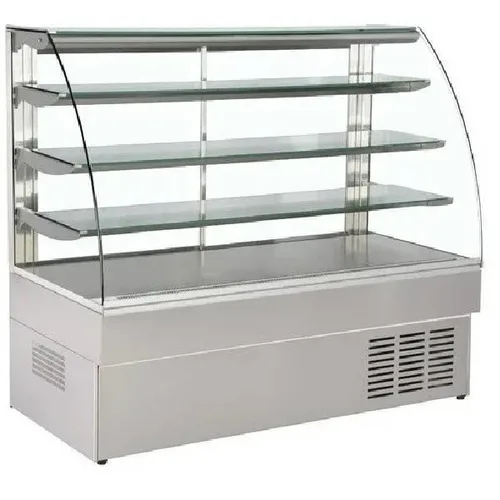 2-shelf stainless steel and glass cold display counter. Curved design with 5mm glass, ideal for sweet and bakery shops. Standard height, brown finish.