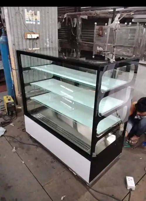 Curved confectionery display counter (5 ft height) with 3 shelves, made of SS and glass. Features 12 mm glass thickness and refrigeration. Suitable for sweet shops. 1-year warranty.