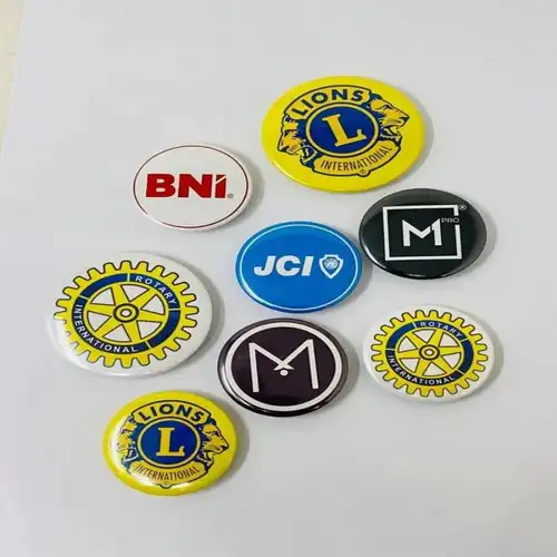 Custom button badges, available in 4.5cm and 5.8cm sizes. Plastic fabric with printed pattern, suitable for all applications. Minimum 20 pieces.