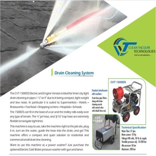 Manual SS drain cleaning machine, 150-200 electric power, 440V. Cleans drains up to 30ft below ground. MS chassis, 200 Bar pump capacity. Weighs 150 Kgs.