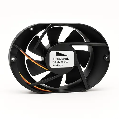 DC brushless cooling fan made of plastic. Operates at 48V with 0.53A current. Features connector for easy integration. Provides efficient cooling airflow.