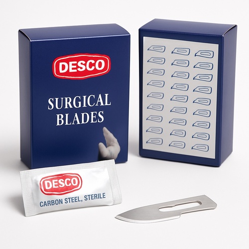 Stainless steel surgical blades with pointed cutting edges. Available in all sizes. Packaged in boxes of 100 units. Ideal for surgical applications.