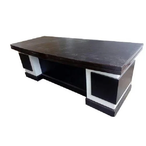 Modern square office table made of dark brown and white wood. Features a polished finish and is ideal for office use. No shelves included.